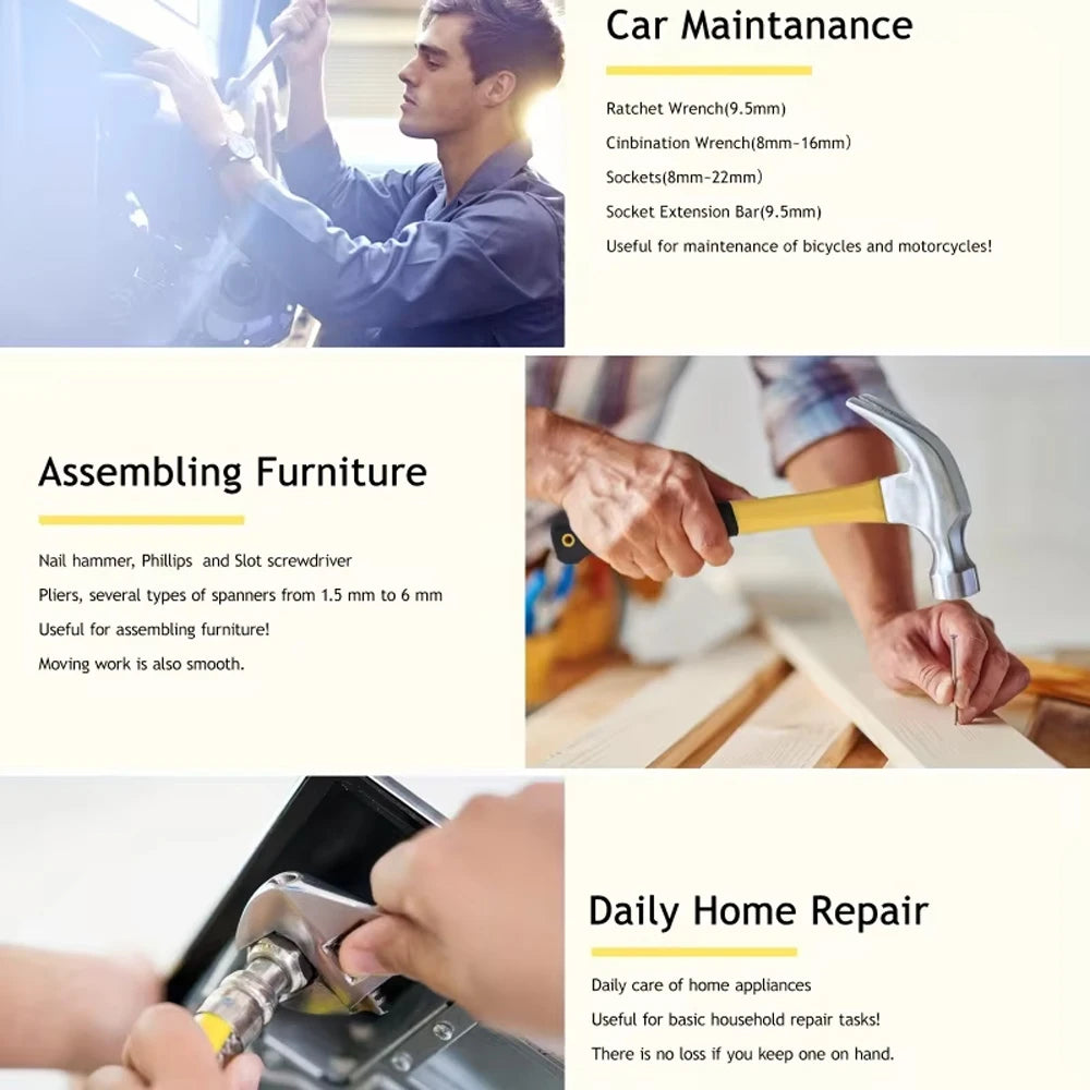 مجموعة مفاتيح ربط شاملة مصممة للإصلاحات المنزلية الأساسية ومشاريع النجارة. مُرتبة في صندوق متين لسهولة التخزين والوصول السريع إلى جميع مستلزمات أعمالك اليدوية.