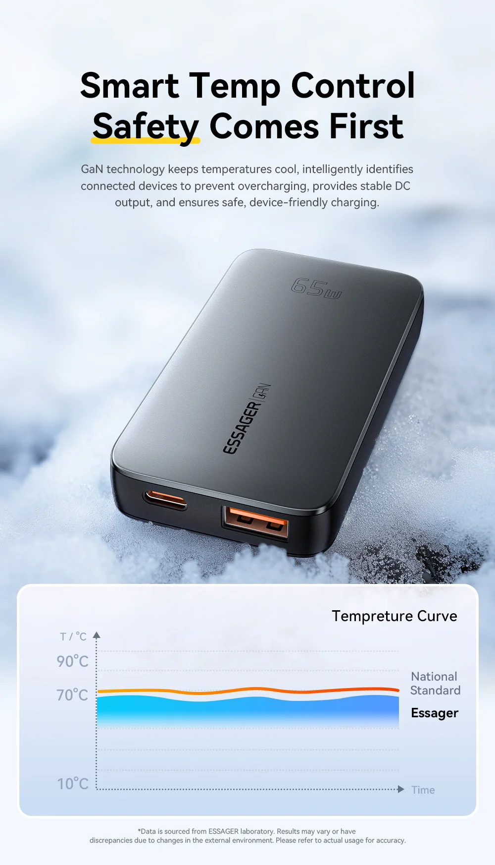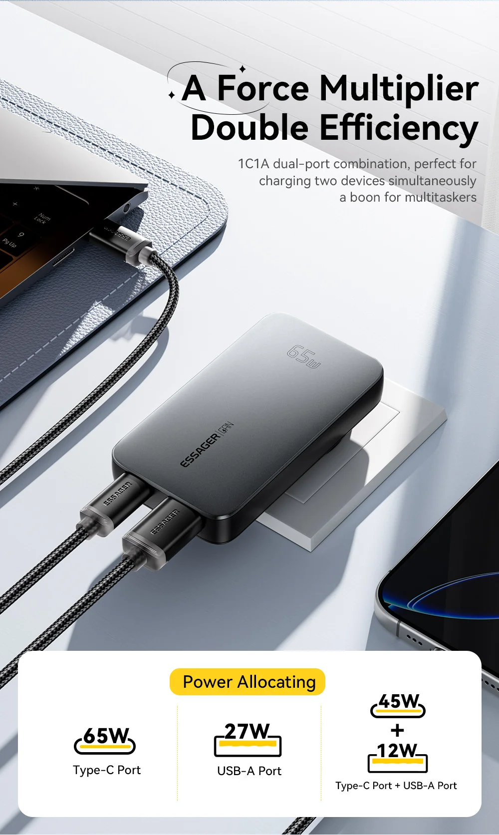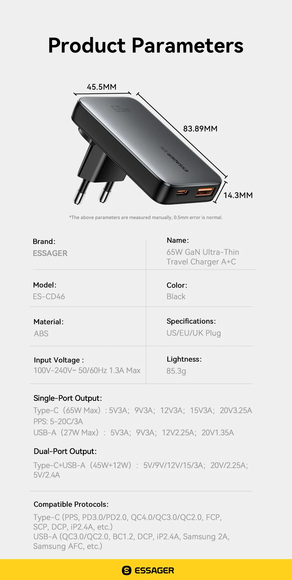 Introducing the ESSAGER Dual-Port Fast Charger, designed for efficient charging with a sleek grey finish. This charger supports various fast charge protocols, including Samsung Adaptive Fast Charge and Qualcomm Quick Charge, delivering a maximum output of 65W.